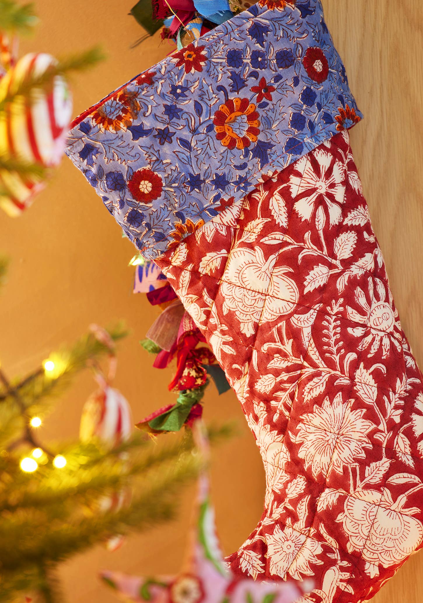 Get ready for the festive season and add some fun to your decor! Create a festive atmosphere with this lovely hanging stocking decoration in the Akya block print. It features a beautiful red and white floral design with a matching hanging loop. The rich red interior is complemented by a cuff of blue, orange, red, and white. You can also pair it with matching Akya decorations and soft furnishings by Namaste!